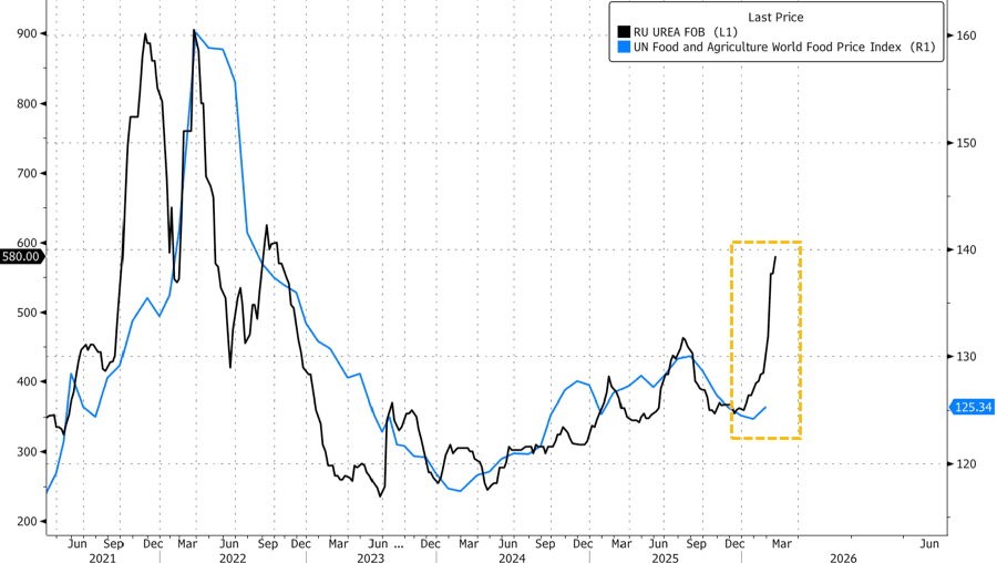 “Given fertilizer accounts for ~20% of grain costs, the largest potential boost to grain prices is more likely to come from reduced grain supply. Fertilizer disruptions may reduce grain production both through yield losses from delayed or sub-optimal nitrogen application and potential acreage shifts toward less fertilizer-intensive crops,” the analysts said.