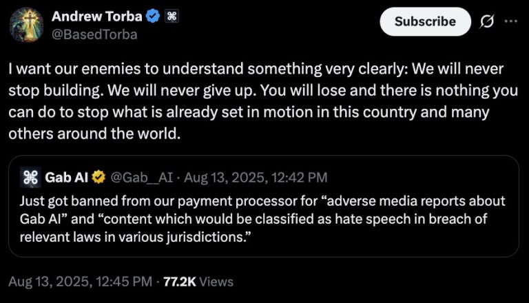 In a blog post addressing the ban, Gab said, “This afternoon the payment cartel struck again and banned Gab AI from processing payments. The same playbook we’ve seen for nine years repeated itself with clockwork precision: Gab hits escape velocity, and the Regime’s enforcers pull the plug.”